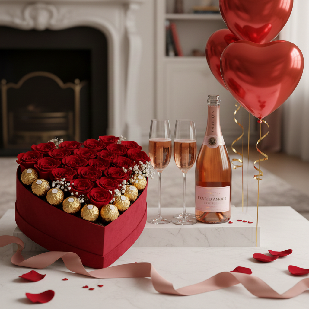 Blüten Glück Geschenk Set Dekorative Herz-Blumenbox mit einem ausgewählten Parfüm, roten und rosafarbenen Rosen sowie verschiedenen dekorativen Blüten. Diese stilvolle Kombination aus Blumen und Parfüm eignet sich ideal als romantisches Geschenk oder als besondere Überraschung für einen besonderen Anlass.Die Blumen werden...